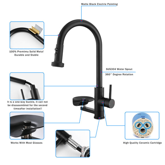 3-in-1 Kitchen Faucet with Press-Type Glass Rinser, High-Arc Pull-Down Sprayer Faucet, 3 Function Spray Mode, Matte Black Finish, for Modern Kitchen Sink