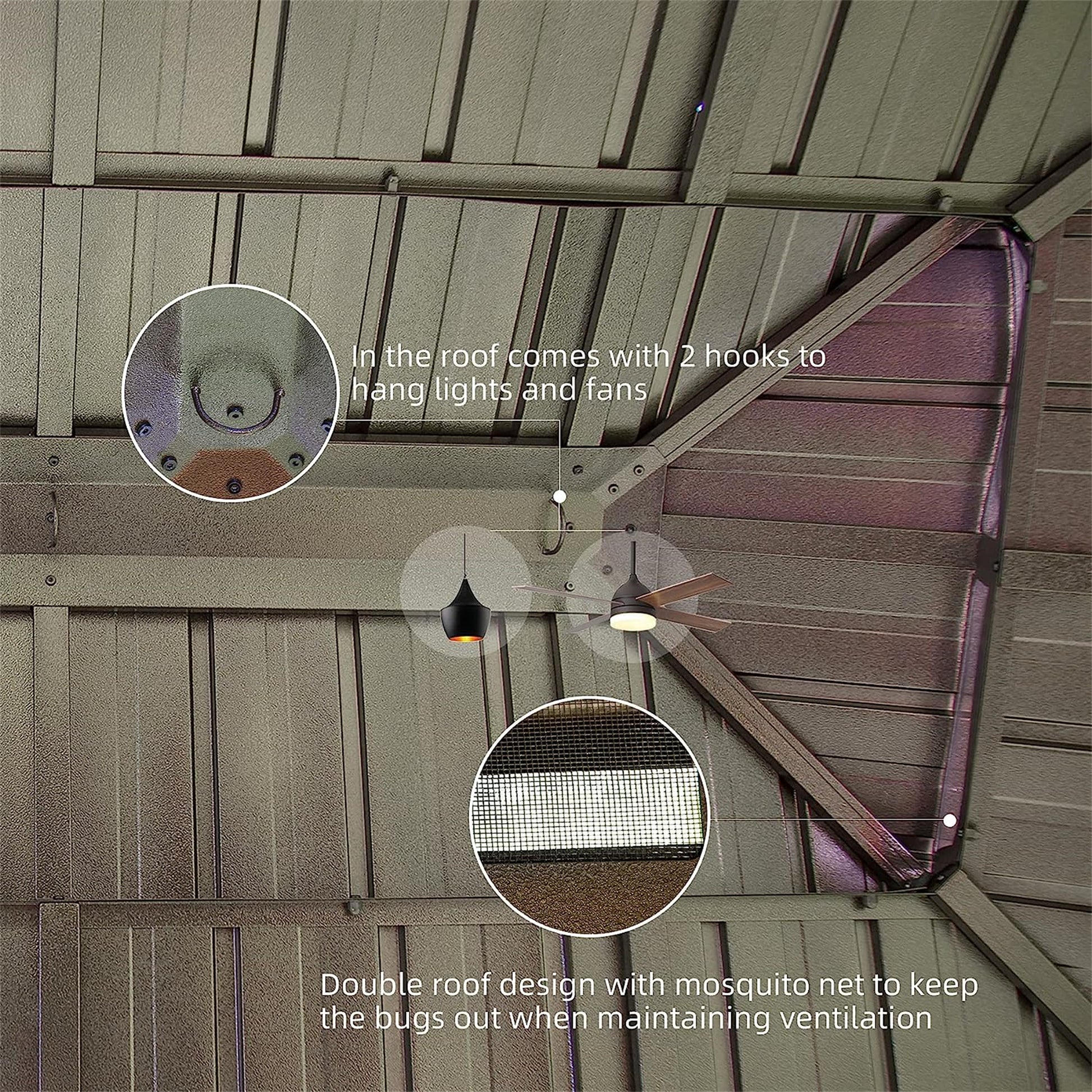 - 1.GALVANIZED STEEL DOUBLE ROOF: W10ftxL12ft(120inchx144inch), Fade-resistant and rust-resistant galvanized steel top, keeps out bright light and harmful UV rays, strong enough to withhold windy or heavy snow. which is not possible with traditional soft top gazebos.