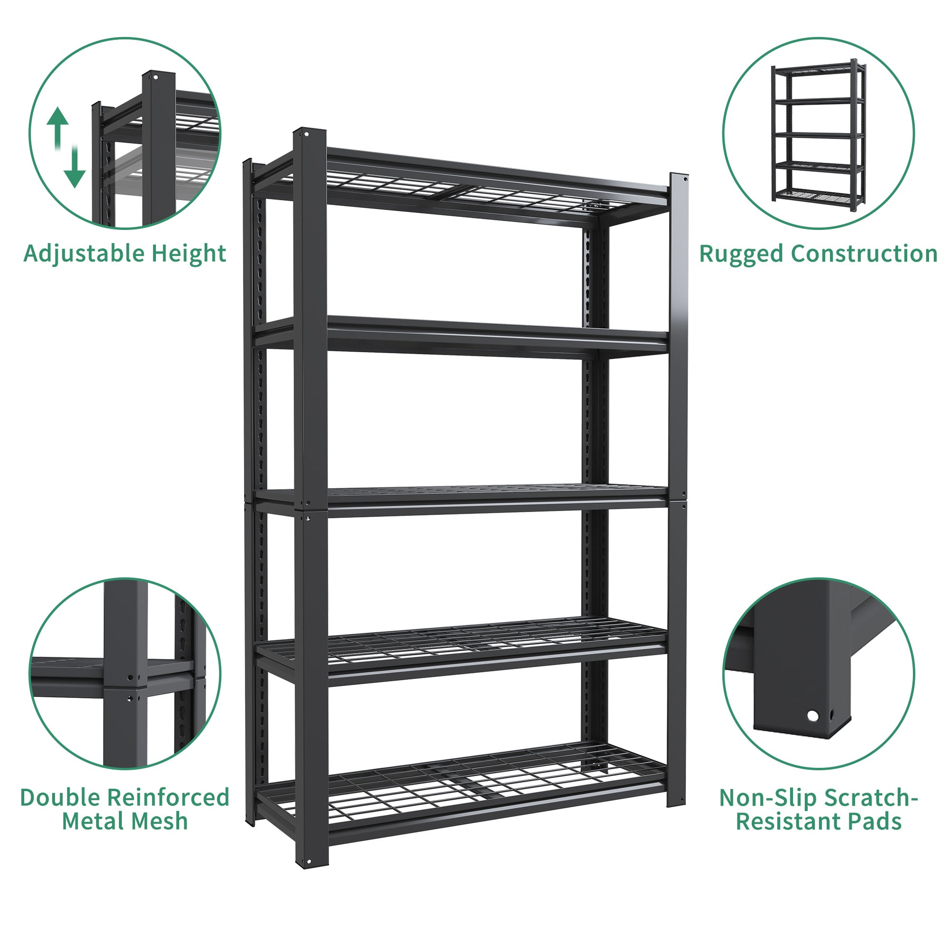 - Heavy-Duty & High Weight Capacity: Built with reinforced steel, this shelving unit supports up to 400 lbs per shelf and 2000 lbs total, providing strong and stable storage for heavy items.