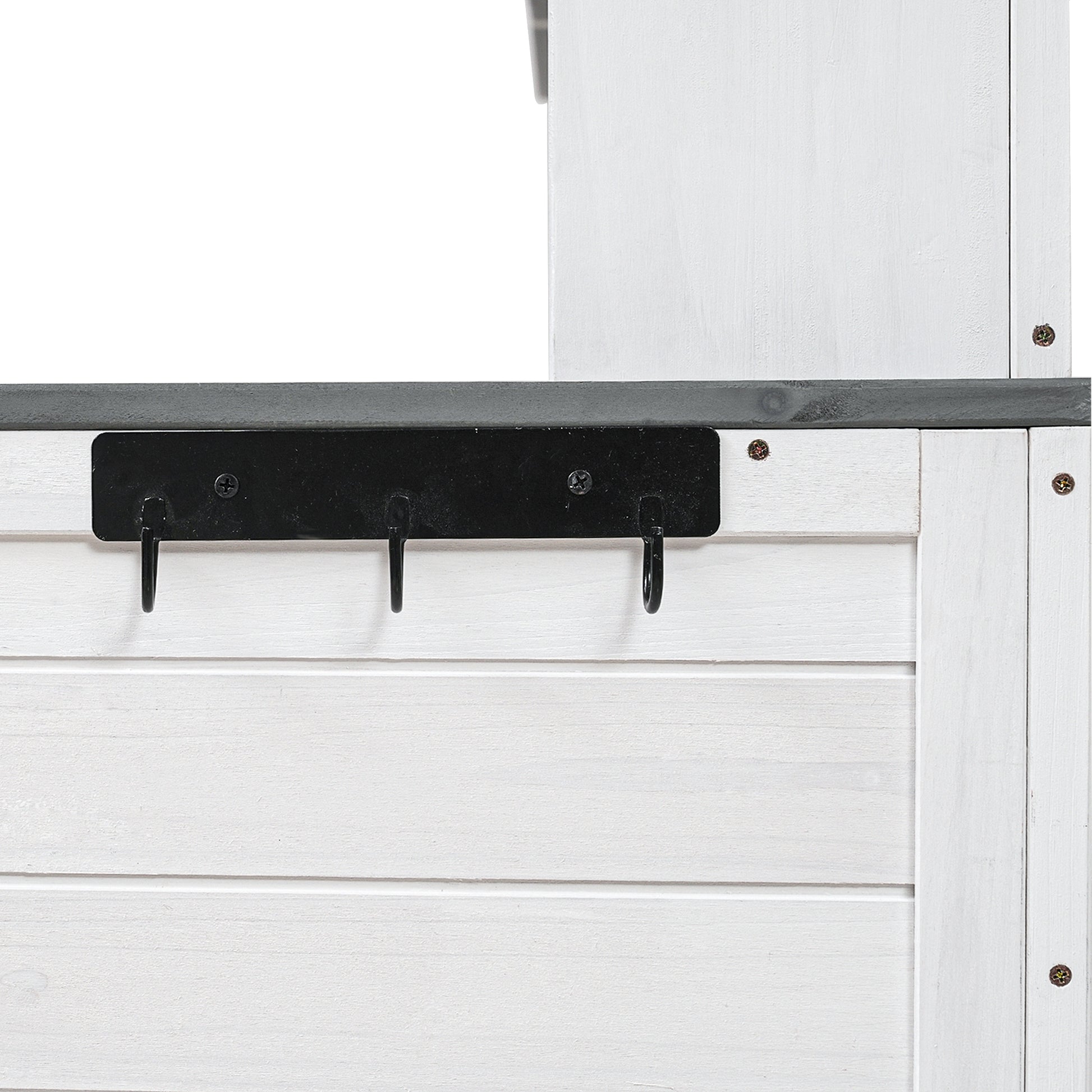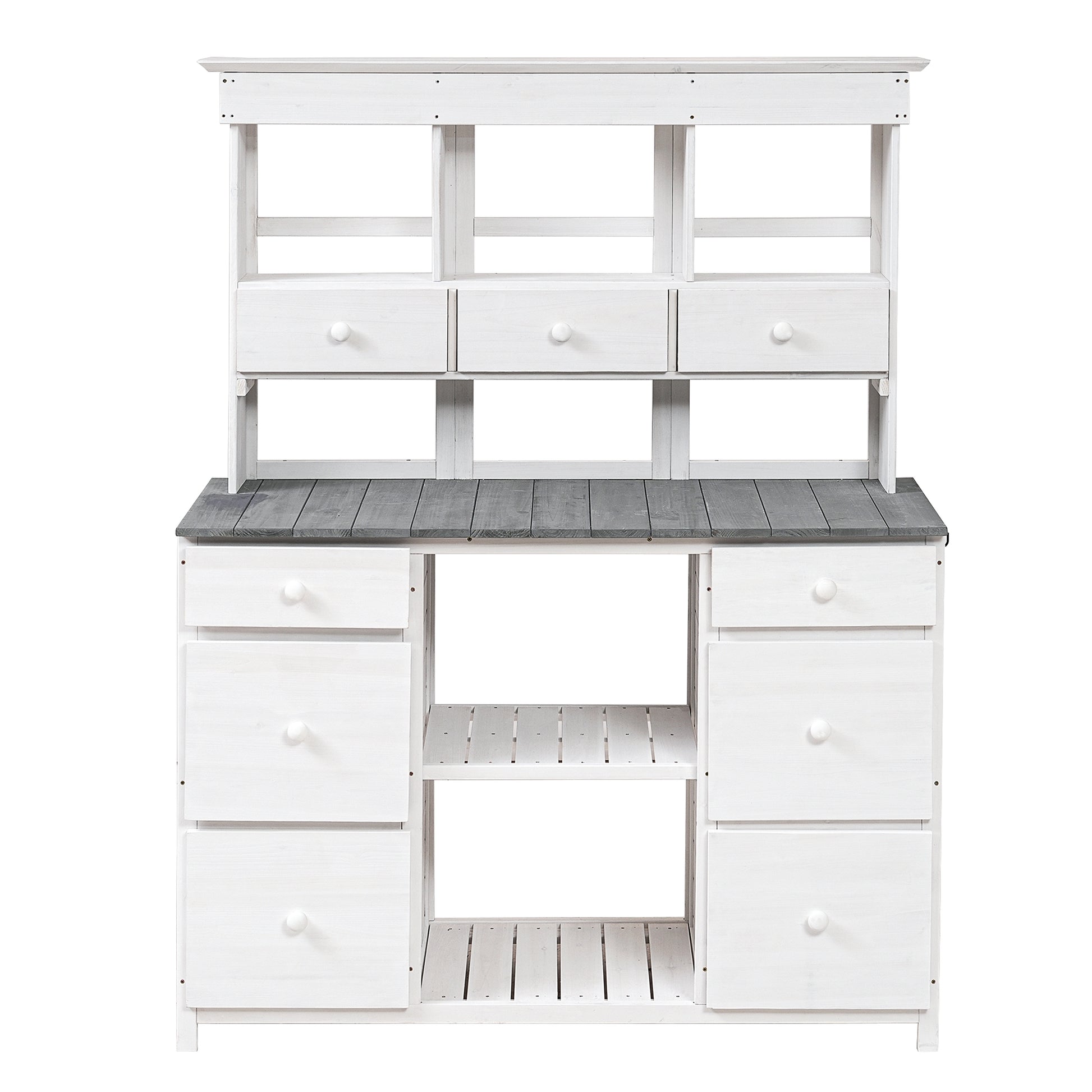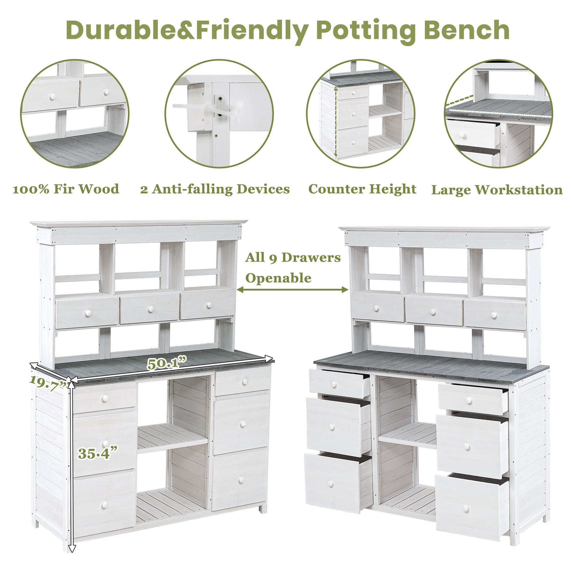 Garden Potting Bench Table, Rustic and Sleek Design with Multiple Drawers and Shelves for Storage, White and Gray