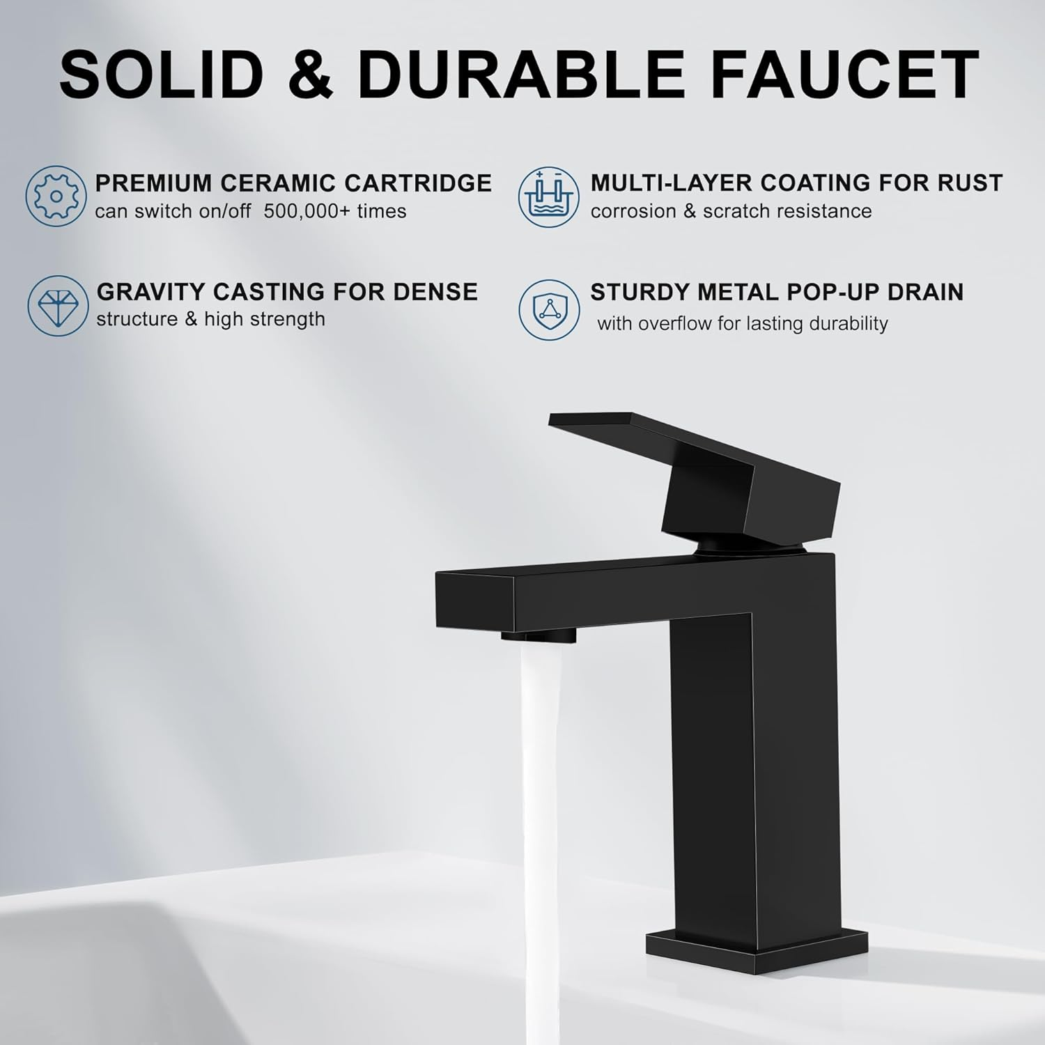 Easy to Install: the square faucet with pre-installed water supply lines and one pop up drain are included in package. It is convenient to install by yourself within 10 mins, no need to hire a plumber to save money
